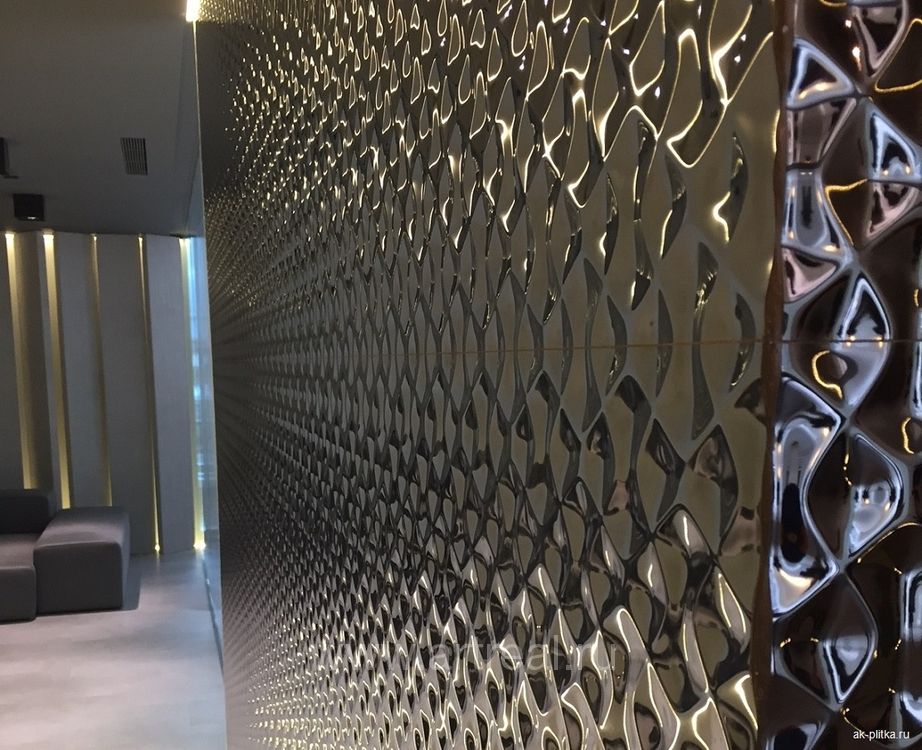 Revestimiento color negro con relieve ondulado en 3D. Porcelanato de origen español disponible en Bolivia. Perfecto para decorar ambientes como salas, baños o cocinas. Formato: 33,3×100