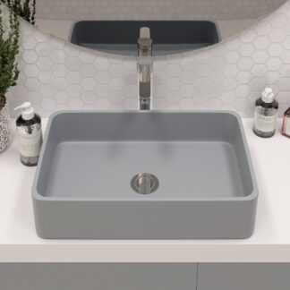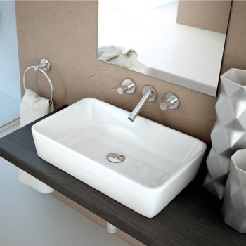 Lavabo sobre encimera de porcelana color blanco brillo.