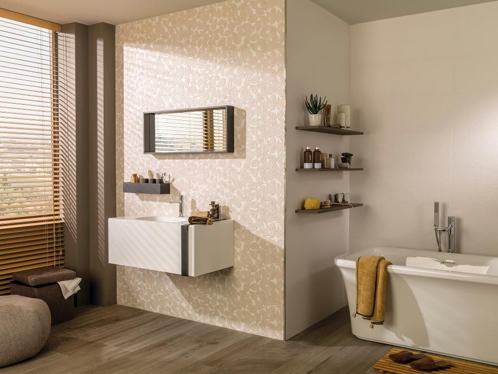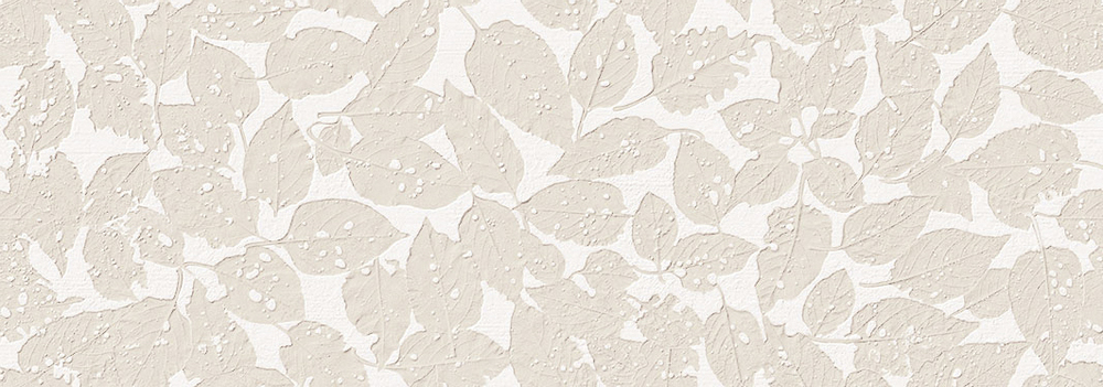 Revestimiento porcelánico de origen español color blanco con hojas en relieve 3D color beige. perfecto para revestir ambientes y detalles de baños, cocinas y otros espacios arquitectónicos. Color: Blanco y Beige Formato: 31,6×90
